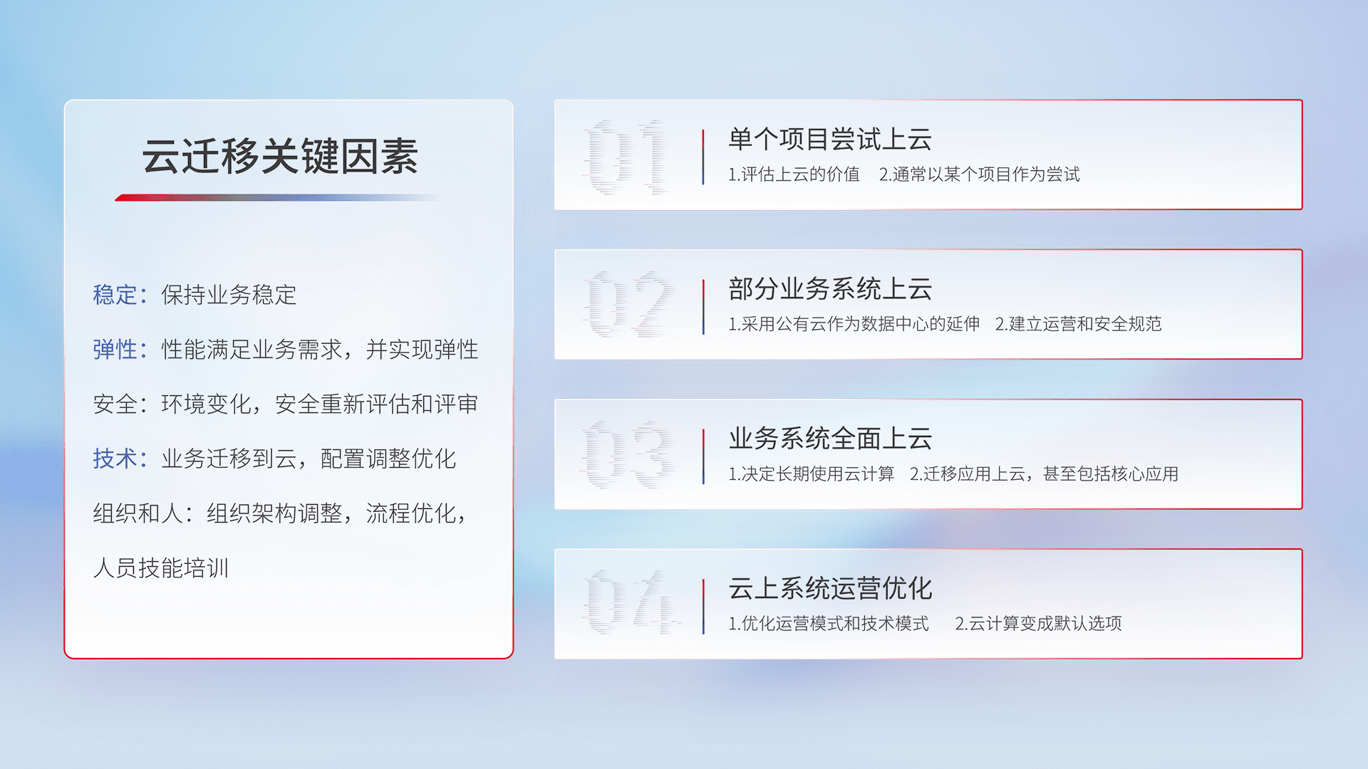 结合实际业务,,,,从规划设计、、、、云平台选型、、、、云原生改造、、、数据迁移、、、集成交付,,,迁移全过程为客户识别最佳上云路径,,,做好风险识别管理,,设计网络架构、、身份权限、、、、安全审计合规、、、、操作审计、、、、日志审计、、、监控告警策略、、、多站点容灾设计等,,对云上基础设施进行整体规划,,,提升IT治理水平,,,以满足弹性、、高可用、、高性能的需求。。